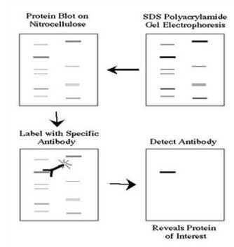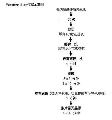 Western Blot與Southern印跡雜交或Northern印跡雜交方法類似,但Western Blot采用的是聚丙烯酰胺凝膠電泳 ,被檢測物是蛋白質(zhì),“探針”是抗體,“顯色”用標記的二抗。經(jīng)過PAGE分離的蛋白質(zhì)樣品,轉(zhuǎn)移到固相載體(例如硝酸纖維素膜NC膜 )上,固相載體以非共價鍵形式吸附蛋白質(zhì),且能保持電泳分離的多肽類型及其生物學活性不變。以固相載體上的蛋白質(zhì)或多肽作為抗原,與對應的抗體起免疫反應,再與酶或同位素標記的第二抗體起反應,經(jīng)過底物顯色或放射自顯影以檢測電泳分離的特異性目的基因表達的蛋白成分。該技術(shù)也廣泛應用于檢測蛋白水平的表達。其圖解為: