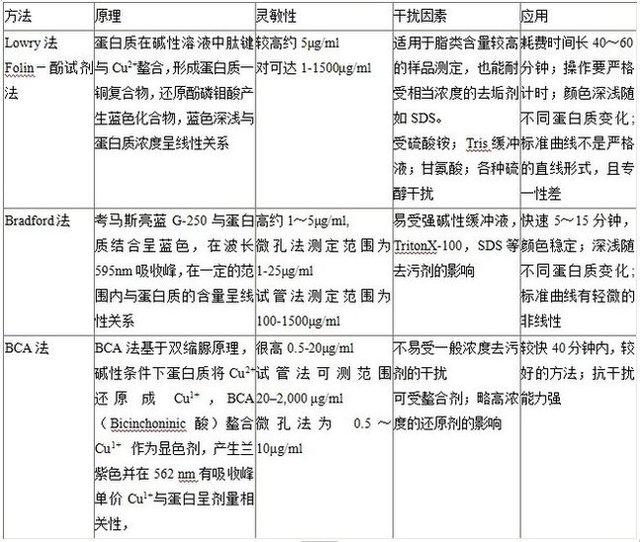 Bradford 法 Lowry 法或BCA 法 (操作簡單、需分光光度計或酶標儀),小牛血清白蛋白 (BSA) 作為標準曲線。如果裂解液中有NP40或其它表面活性劑,則推薦使用BCA 法。三種方法或產(chǎn)品比較