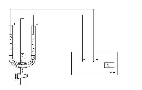 本實(shí)驗(yàn)是采用宏觀電泳法來(lái)測(cè)定ζ電勢(shì)。宏觀法是觀測(cè)膠體溶液與另一個(gè)不含膠粒的無(wú)色導(dǎo)電溶液的界面在電場(chǎng)中的運(yùn)動(dòng)速度。對(duì)高度分散的溶膠(如Fe(OH)3溶膠和As2S3溶膠)或過(guò)濃的溶膠,只能用宏觀法。測(cè)定裝置如下: