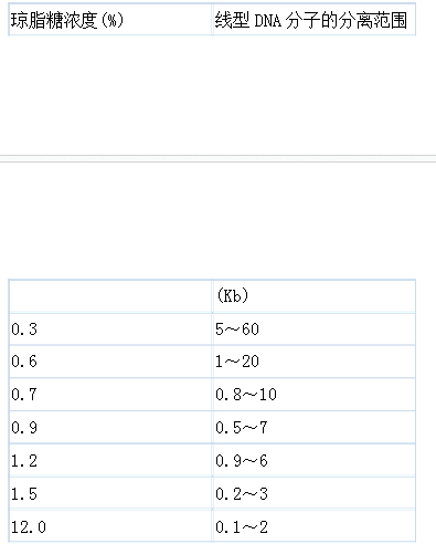 瓊脂糖濃度的配置可參照下表#p#分頁標(biāo)題#e#