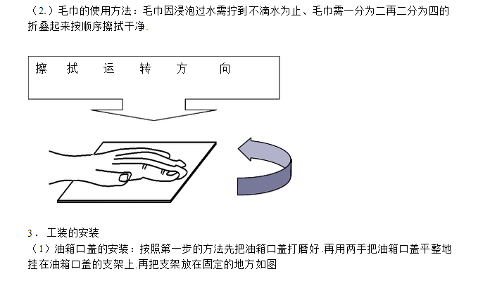 4.工裝的安裝:對(duì)各車型的油箱口蓋、后尾箱蓋的工裝安裝 二:生產(chǎn)作業(yè)要領(lǐng) 1. 平面打磨: