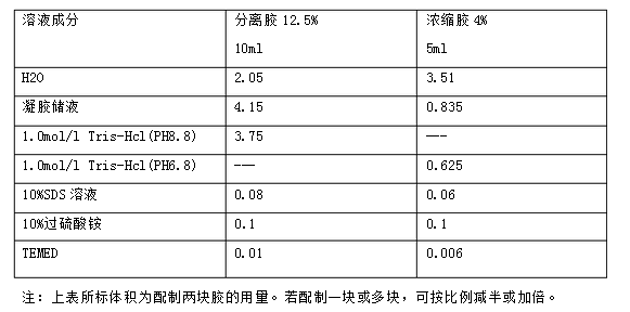 0.1g過(guò)硫酸銨+1ml雙蒸水。使用前新鮮配制(5)Tris–甘氨酸電泳緩沖液的配制(25mmol/L Tris;250mmol/L甘氨酸(pH8.3))