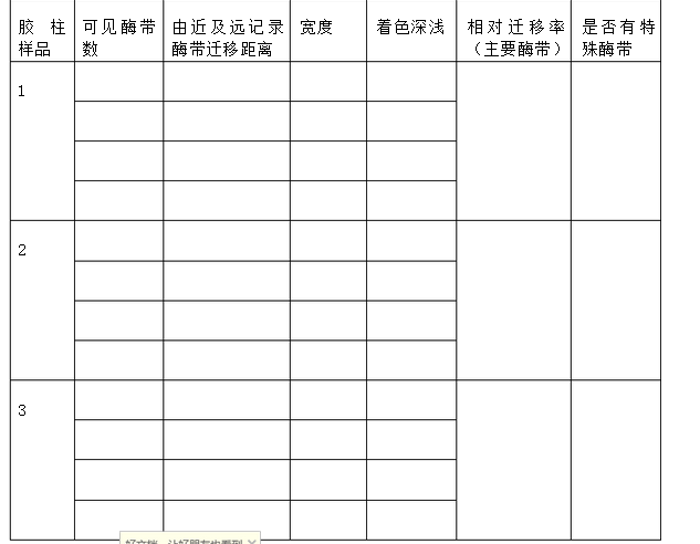 1、將各膠柱中酶帶條數(shù)、寬度、著色深淺和移動(dòng)距離填入表中。