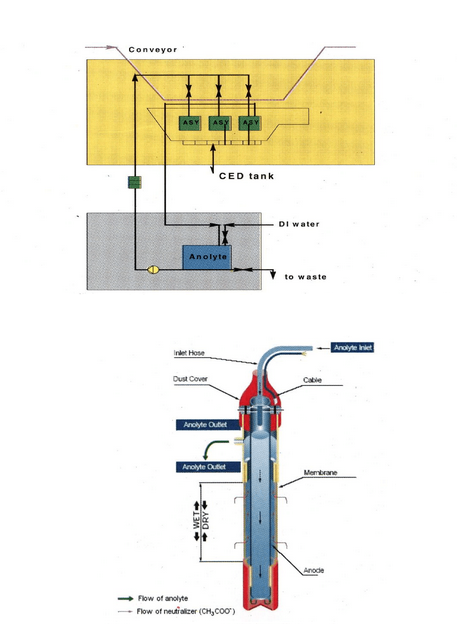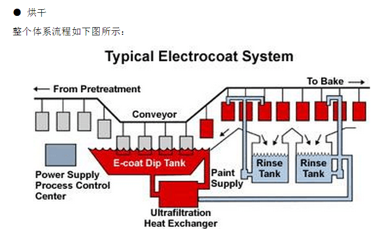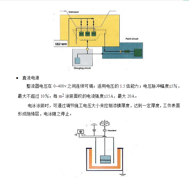 CED電泳涂裝線包括漆液循環(huán)系統(tǒng)、陽(yáng)極系統(tǒng)、超濾系統(tǒng)、清洗系統(tǒng)、加料系統(tǒng)以及直流電源等六大部分組成。