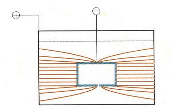 包含內(nèi)腔的工件(陰極)與陽(yáng)極之間建立電場(chǎng),電泳首先在工件外表面開(kāi)始。