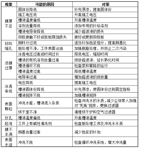 HED系列陰極電泳涂料在施工過(guò)程中,盡管在規(guī)定的工藝參數(shù)下實(shí)施監(jiān)控和管理,但由于各種相關(guān)條件的影響,仍存在出現(xiàn)問(wèn)題的可能性。為了方便用戶的使用,我們特把易發(fā)生的問(wèn)題,產(chǎn)生的原因及解決方法列表如下:#p#分頁(yè)標(biāo)題#e#